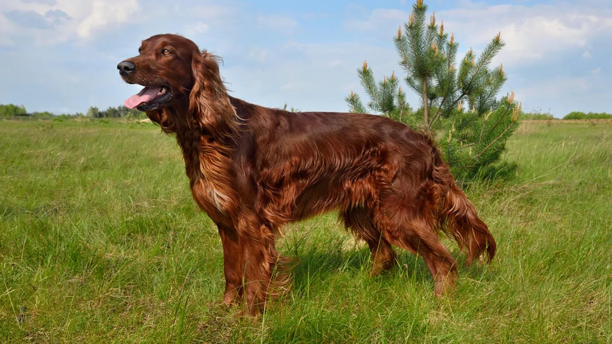 El setter irlandés es un perro bastante alto, con un aspecto elegante y un sedoso pelaje rojizo. Sus principales características son: